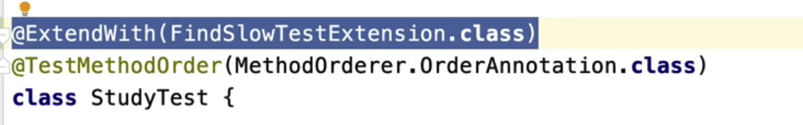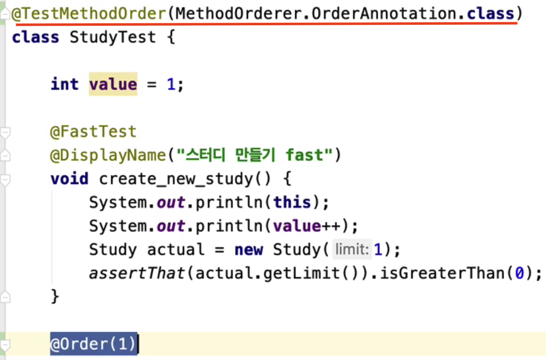 - 경우에 따라, 특정 순서대로 테스트를 실행하고 싶을 때도 있다. 그 경우에는 테스트 메소드를 원하는 순서에 따라 실행하도록 @TestInstance(Lifecycle.PER_CLASS)와 함께 @TestMethodOrder를 사용할 수 있다.